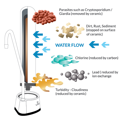 • Stage 1 - The first stage consists of Doulton Ultracarb ceramic which provides genuine sub-micron filtration. The cartridge reduces fine particulate matter, bacteria, cysts and turbidity.